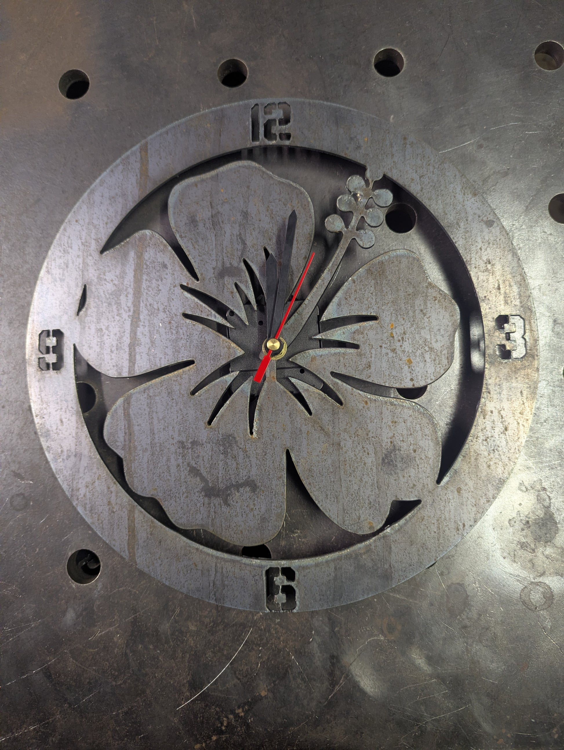 This 300mm wall clock features a detailed floral design precision plasma-cut from solid mild steel. The layered petal detail creates depth and shadow, giving the piece a strong presence on any wall.